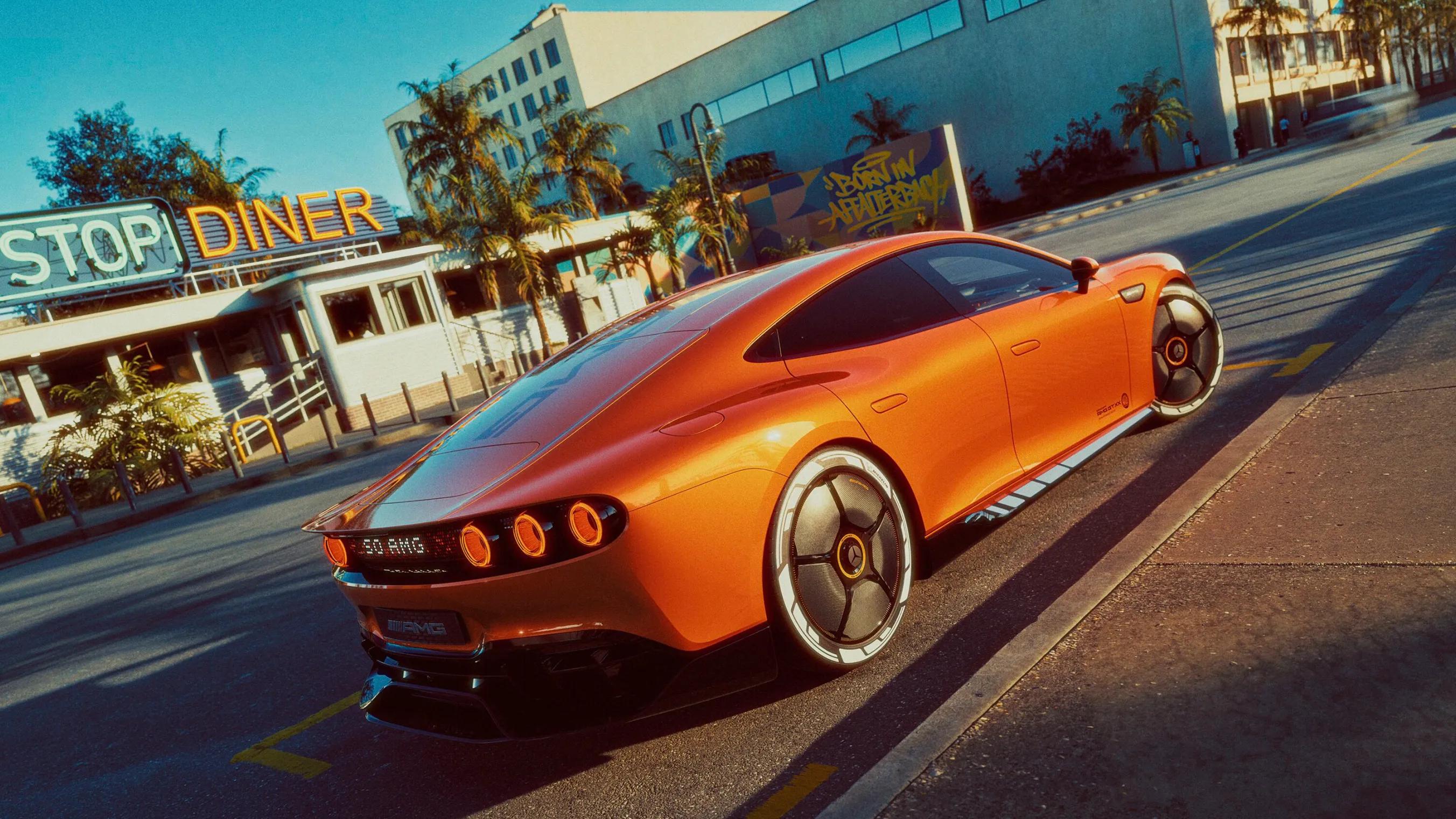 Mit der tief heruntergezogenen Fronthaube, der stark geneigten Windschutzscheibe und dem dynamischen Fließheck ist das CONCEPT AMG GT XX ein Statement für markentypische Sportwagen-Performance. Die auffällige Farbgebung in Sunset beam orange demonstriert Selbstbewusstsein.