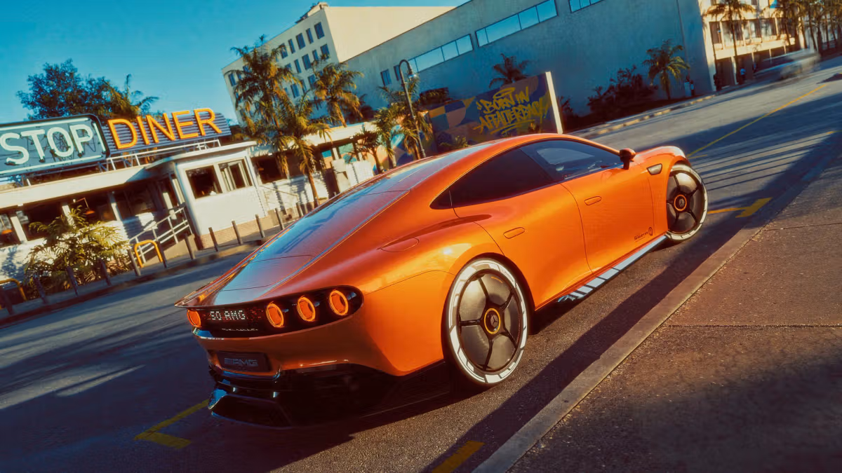Mit der tief heruntergezogenen Fronthaube, der stark geneigten Windschutzscheibe und dem dynamischen Fließheck ist das CONCEPT AMG GT XX ein Statement für markentypische Sportwagen-Performance. Die auffällige Farbgebung in Sunset beam orange demonstriert Selbstbewusstsein.