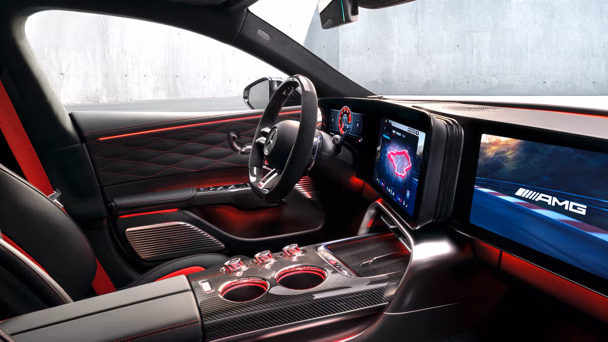 In the rear, however, the focus is on Gran-Turismo qualities: two intelligently designed recesses in the floor provide passengers with generous legroom and comfortable knee angles, offering a high level of long-distance comfort. The dynamic interior concept skilfully combines elements and structures from motorsport with a digital cockpit setting new standards, a driver-oriented central display and a uniquely designed centre console. In short, it has everything you would expect from an in-house development from Affalterbach.