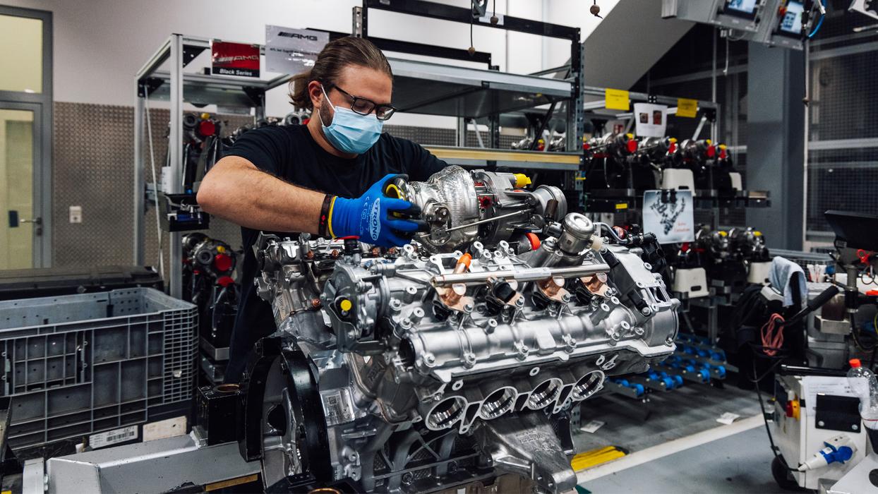 Now, he drives his own C 63 with that engine. He works as a floater, knowing how to build both four- and eight-cylinder engines, and has done additional training which enables him to operate the cold test benches, where the finished engines are checked.